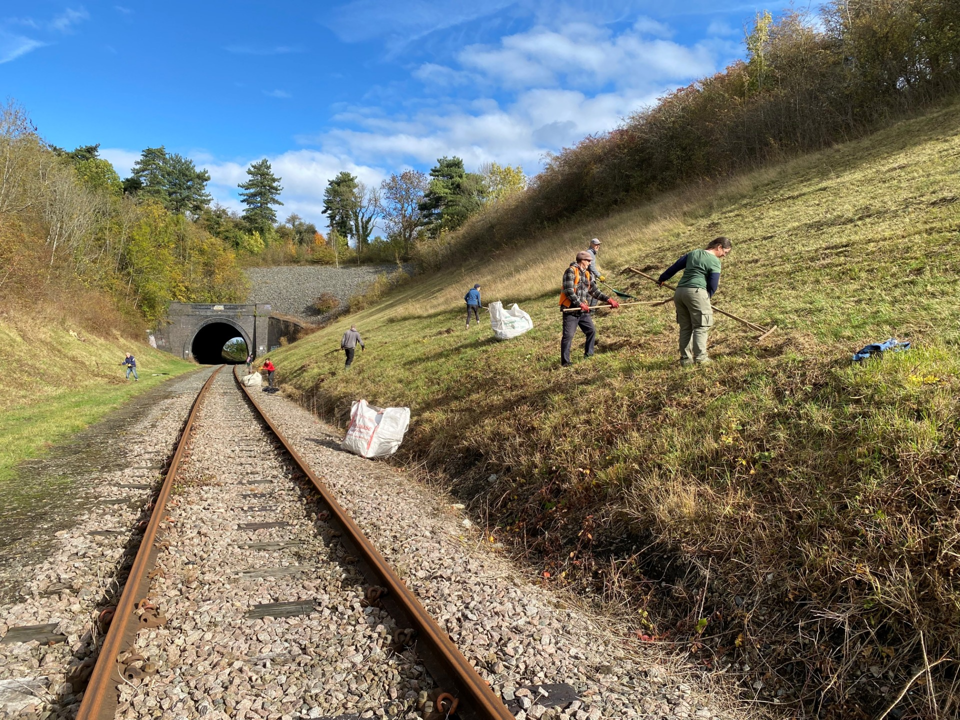 On Tuesday, 10 volunteers came together to help us to enhance this short section of cutting for its biodiversity intertest, including for the grizzled skipper butterfly. We worked just above the railway track bed, on the lower sections of the cutting. These are locations that have been identified by our volunteers, who give their time to monitor this site (and many other sites too) during the spring flight season, as being particularly important for the grizzled skipper. We cleared areas of bramble, rose, hawthorn and blackthorn and created an area of sparsely vegetated ground on the exposed slopes. In spring due to their angle, these slopes warm up quickly in the spring sunshine and create great locations for invertebrates.